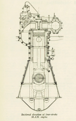 A feature of German post-war shipping has been the increasing number of ships propelled by either direct-coupled or geared M.A.N. four-stroke Diesel engines. These are m anufactured with exhaust-gas pressure-charging or as normally-aspirated units, the supercharged units having the relatively conservative mean effective pressure of 9 1 kg. per sq. cm. (129 per sq. in.). It is known, of course, that the Maschinenfabrik Augsburg Nurnberg A.G. has been actively pursuing the development of the highly supercharged four-stroke engine, the results of which have been previously published.