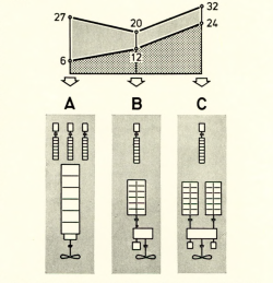 Comparison of three propulsion and generating plants with approximately the same output showing how the total number of cylinders is reduced in scheme B by the use of a V6V 52/55 main engine and one Diesel-driven generator set— The figures on the graph represent the total number of cylinders per layout (top) and the number of main engine cylinders (bottom) In layout B, a V6V52/55 main engine with geared generator and a high-speed R8V22/30ATL auxiliary engine, giving an aggregate of 20 cylinders, the lowest total of three solutions, with correspondingly reduced maintenance work.
